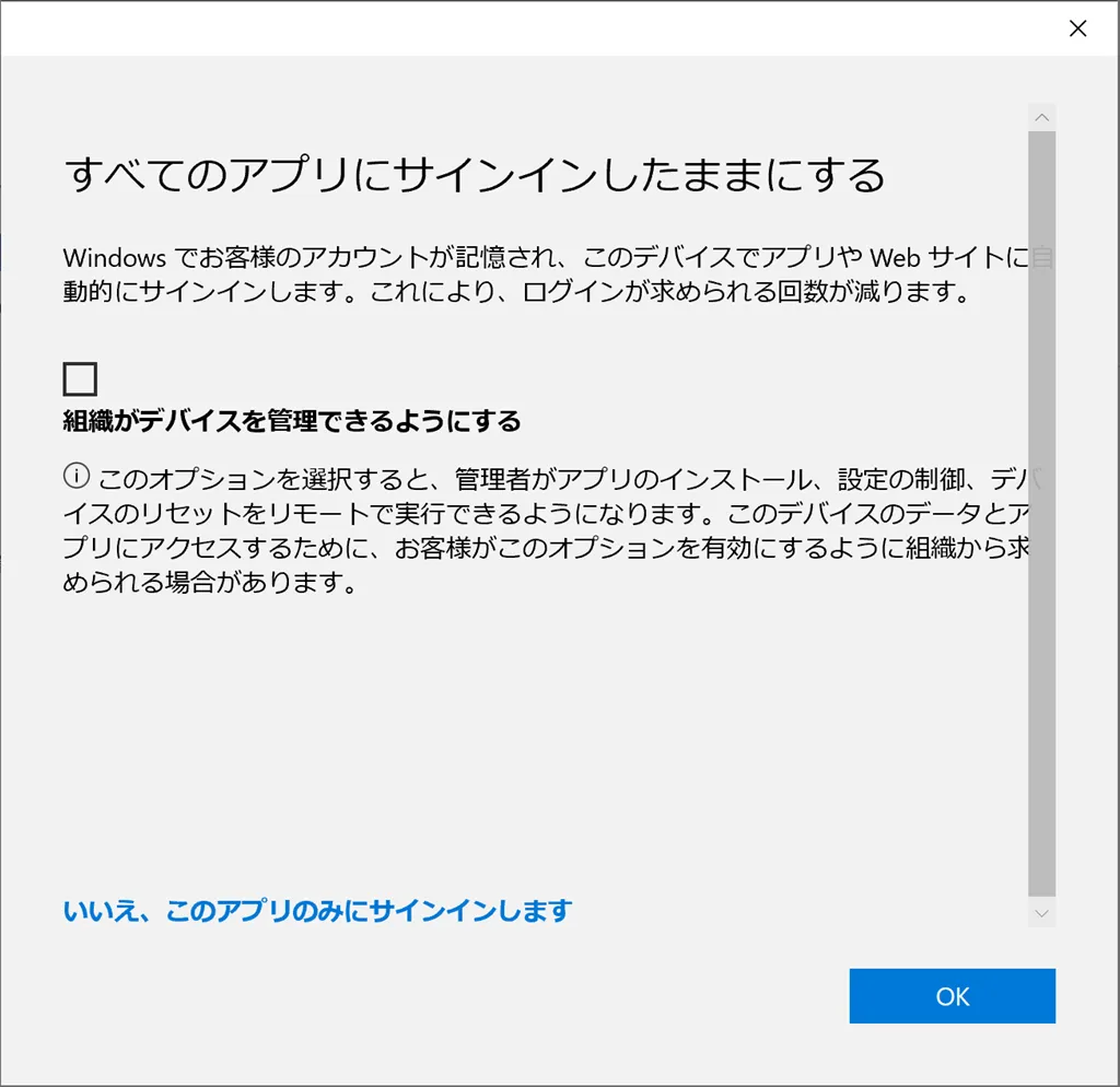 サインインが完了すると,「すべてのアプリにサインインしたままにする」というダイアログが表示されることがあります.ここでの設定内容によっては,Officeアプリの利用中にエラーメッセージが発生しうることが確認されています.これを防ぐため,「組織がデバイスを管理できるようにする」のチェックを外して「OK」をクリックしてください.