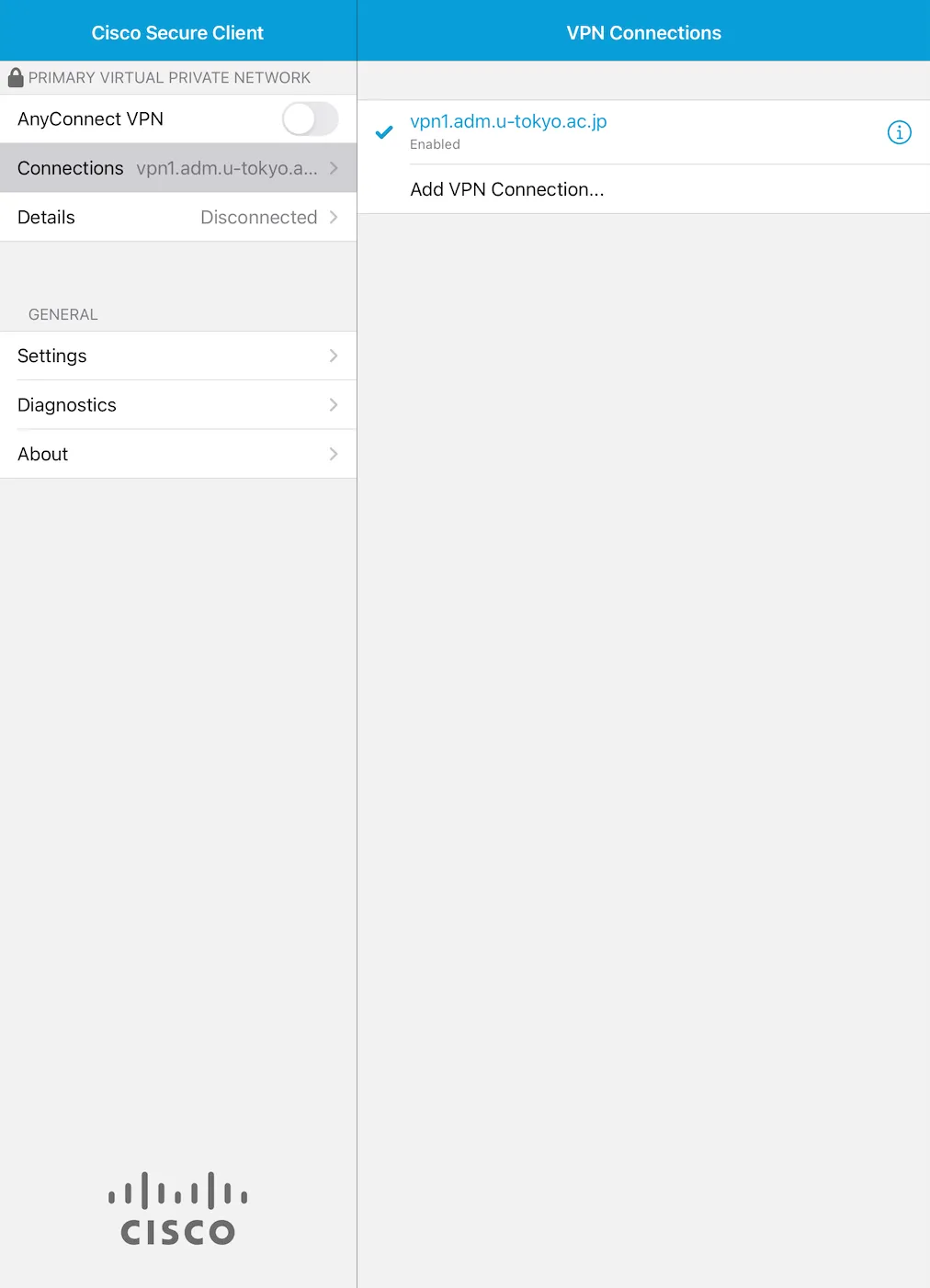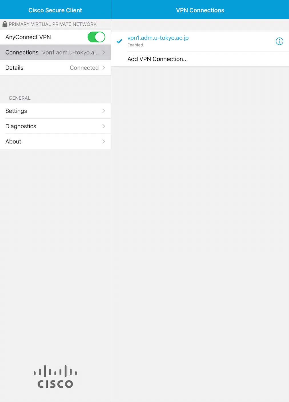 Step G: Your device is connected to the UTokyo VPN if the “Details” screen shows “Connected” as shown below.