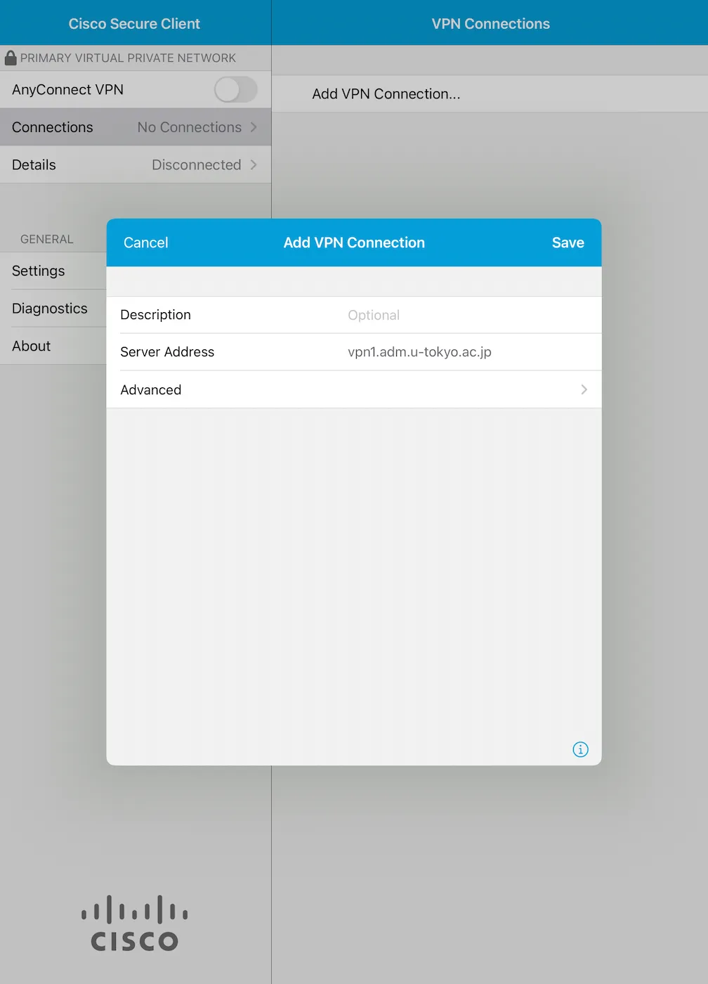 Step C: Tap “Connections” on the upper left of the screen after you launch the application, and then tap “Add VPN Connection…” on the subsequent screen. The following screen will appear. Tap the input field next to “Server Address” and enter vpn1.adm.u-tokyo.ac.jp.