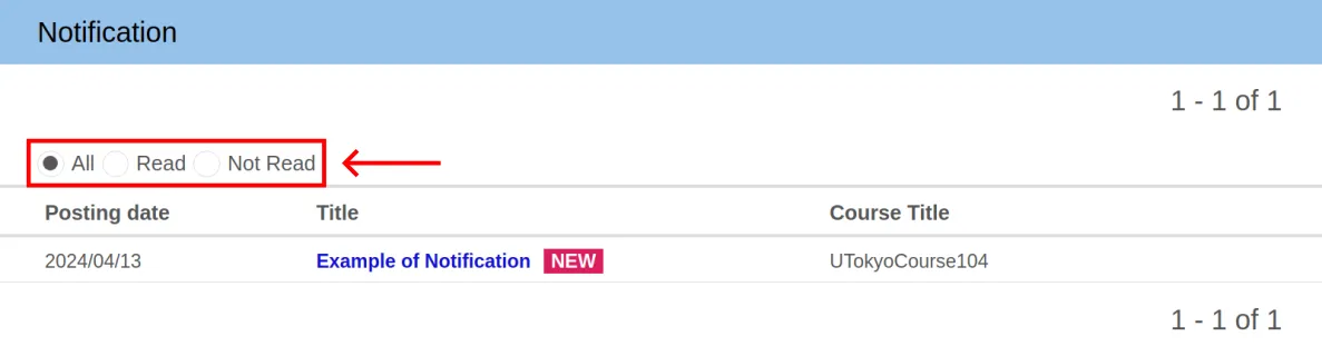 The UTOL’s notification function includes “Updates”, which automatically notifies you when there are updates to course materials, and “Notifications”, which are registered by your course instructor.