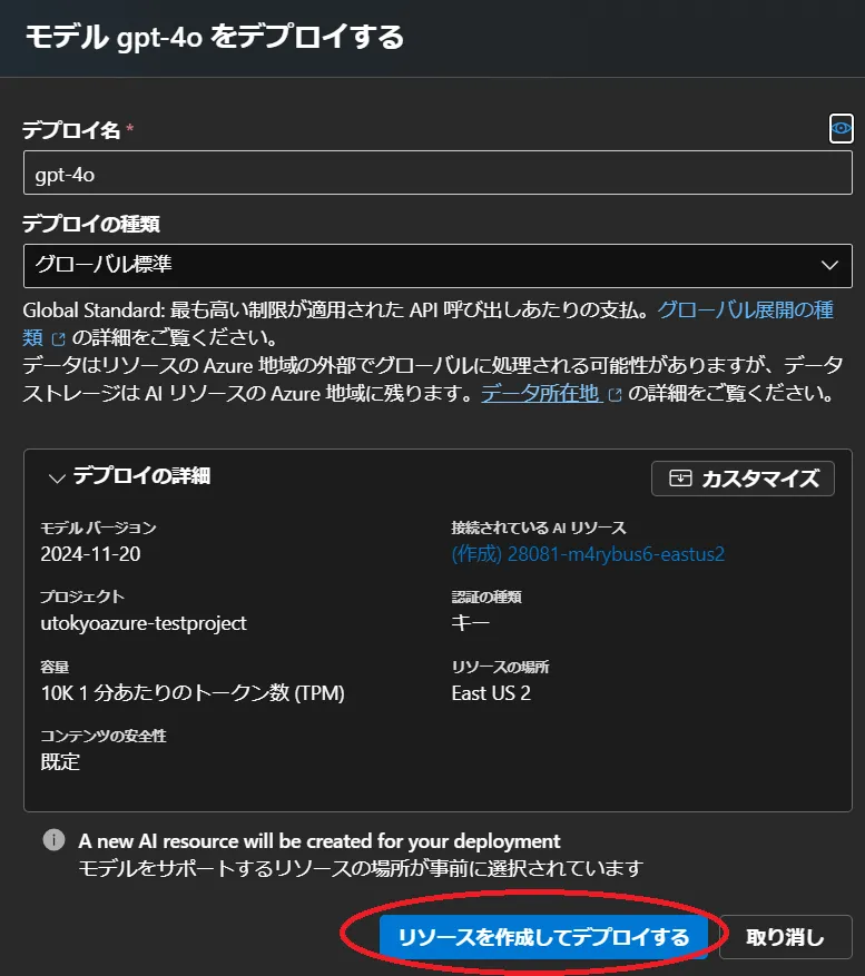 • 確認画面になるので,リソースを作成してデプロイするをクリック.