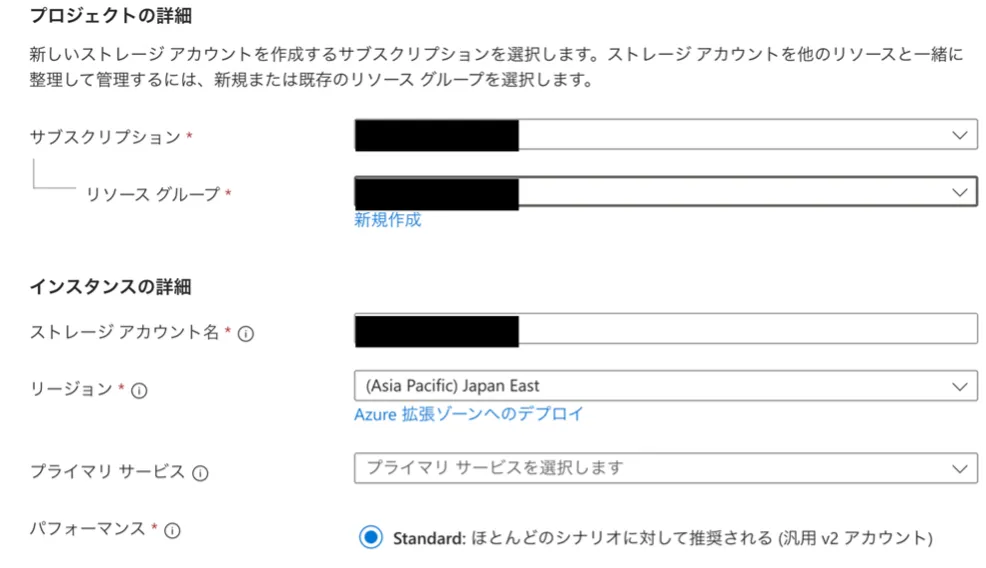 • 適切なサブスクリプション,リソースグループを選択し,ストレージアカウント名を入力します.ストレージアカウント名は,規則のもとで自由に設定できます.