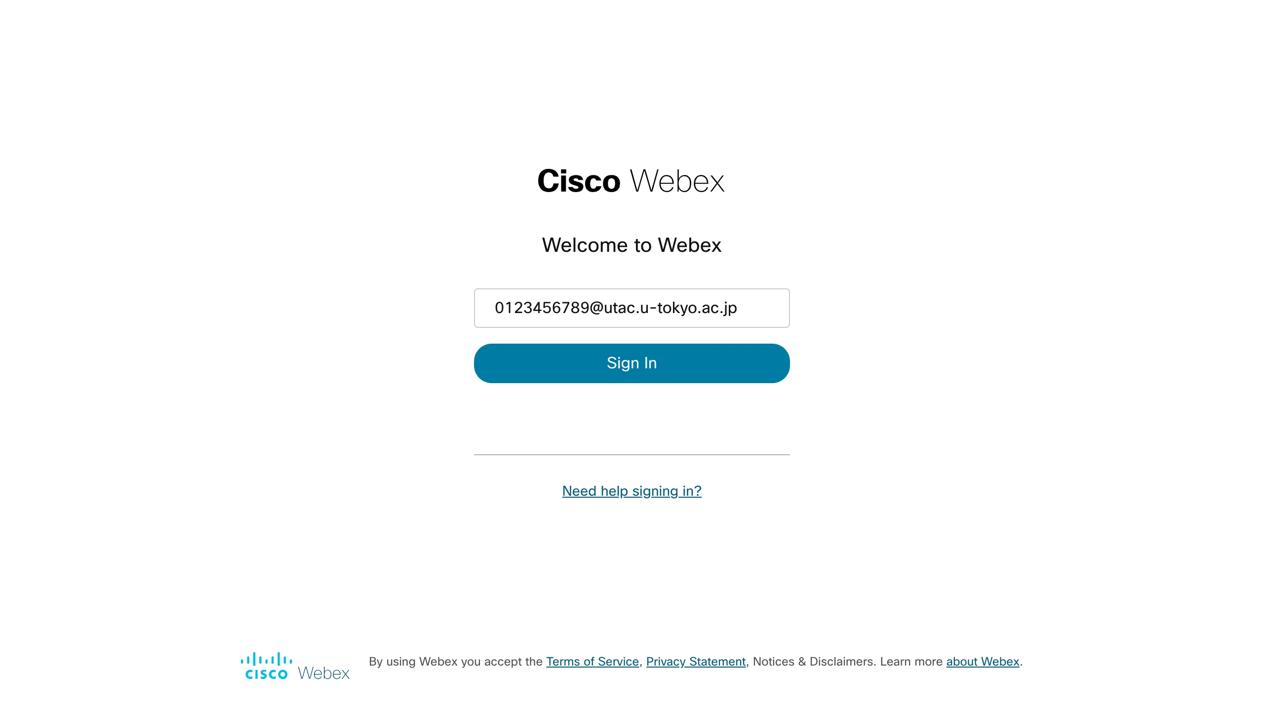 - 画面右上の「サインイン」をクリックしてから,「Log in with Webex」をクリックしてください.この画面の「Your email」の欄は利用しません.