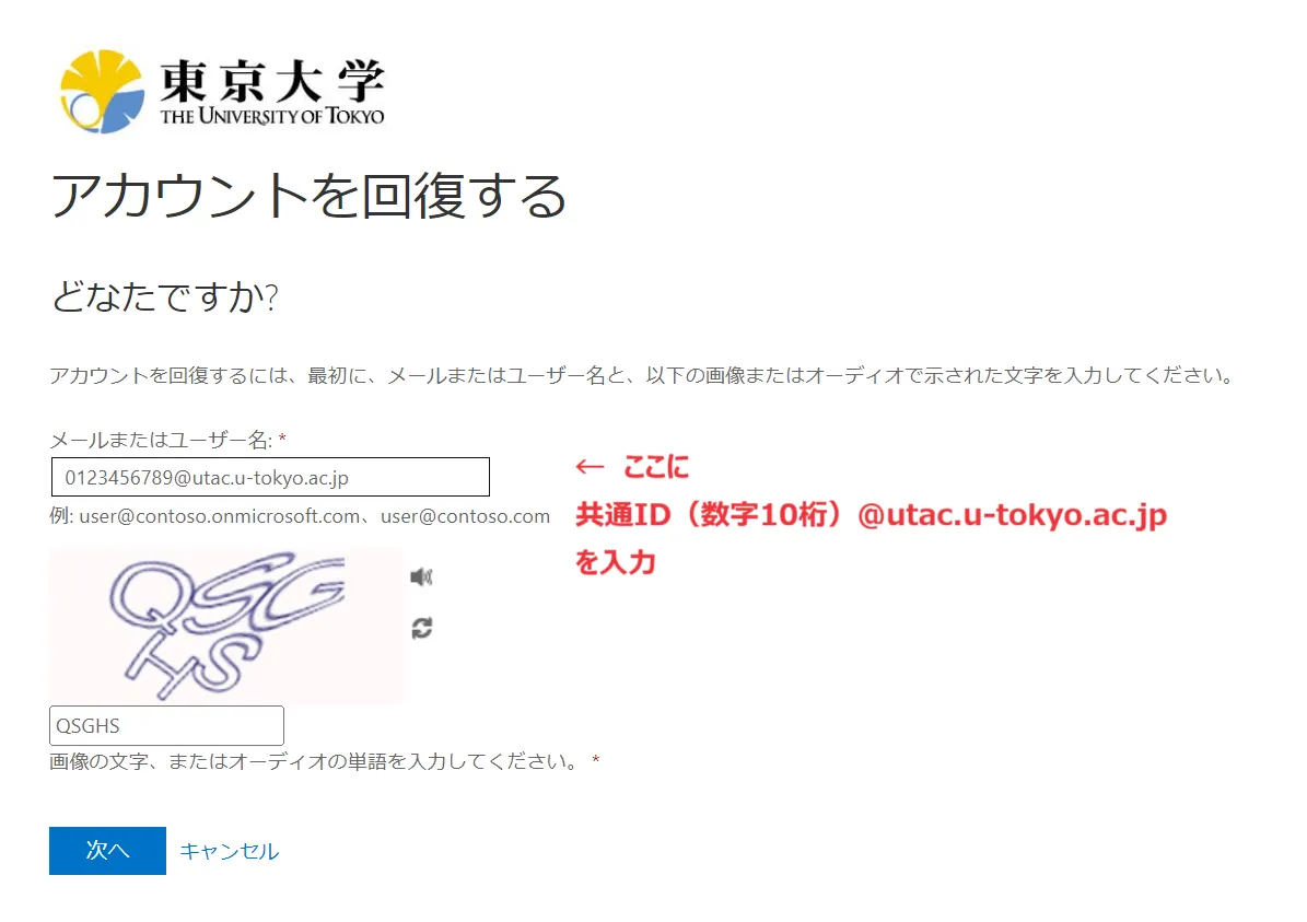 2. 以下のような「アカウントを回復する」という画面が表示されるので,「メールまたはユーザ名」の欄に「10桁の共通ID+@utac.u-tokyo.ac.jp」を,その下の欄に画像の文字を入力してから「次へ」を押してください.