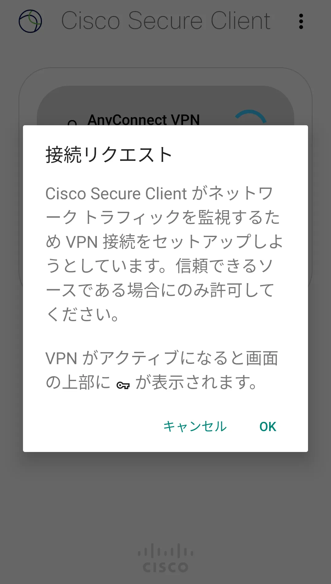 手順B: インストールを終えてSecure Clientアプリを開くと,以下の1枚目のような画面が出るので内容を確認のうえ「OK」をタップしてください.2枚目のような画面が出たらインストールは完了です.
