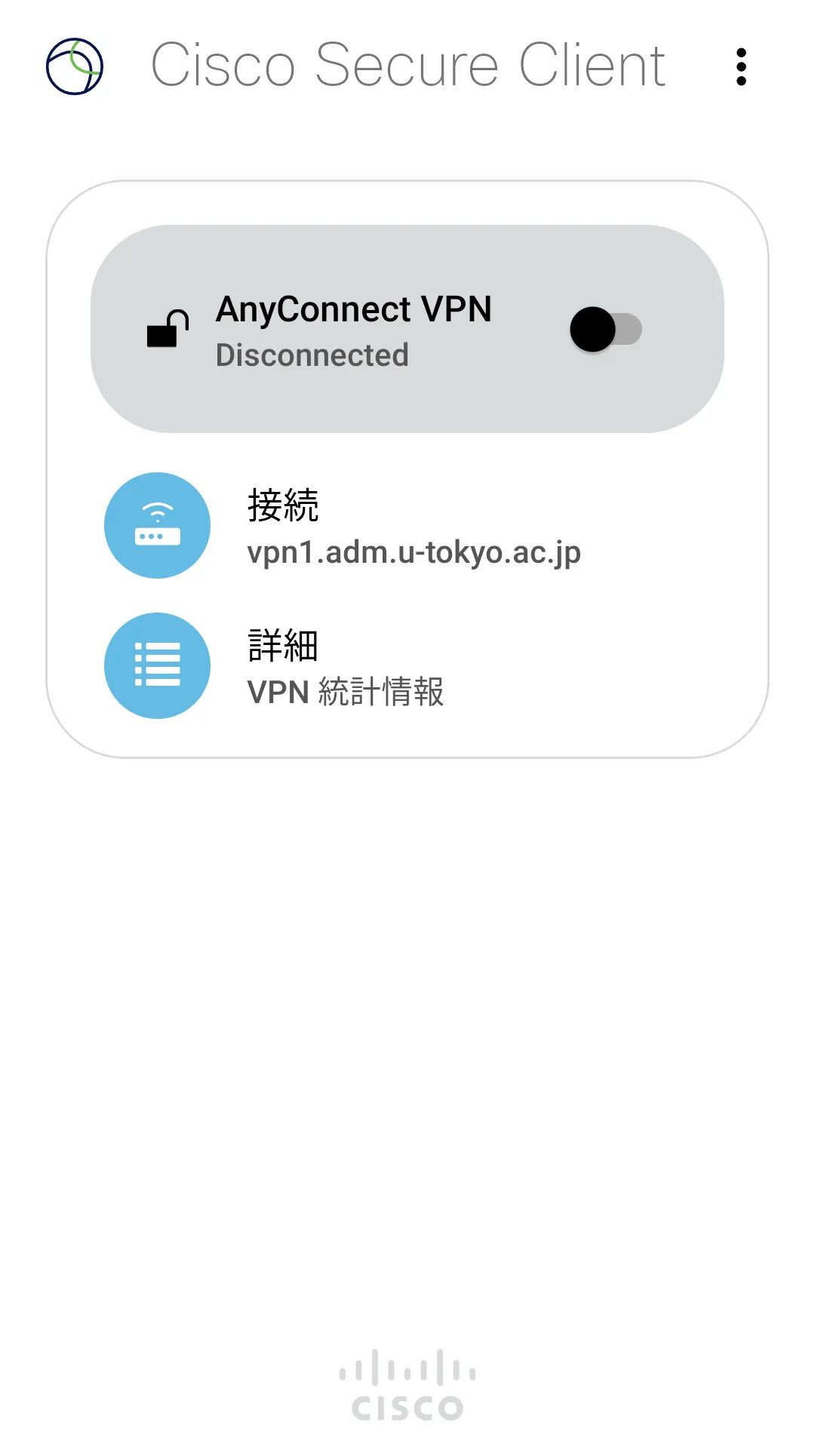 VPNを切断する際は,この画面のトグルボタンをタップして「切断されました」になったことを確認してください.
