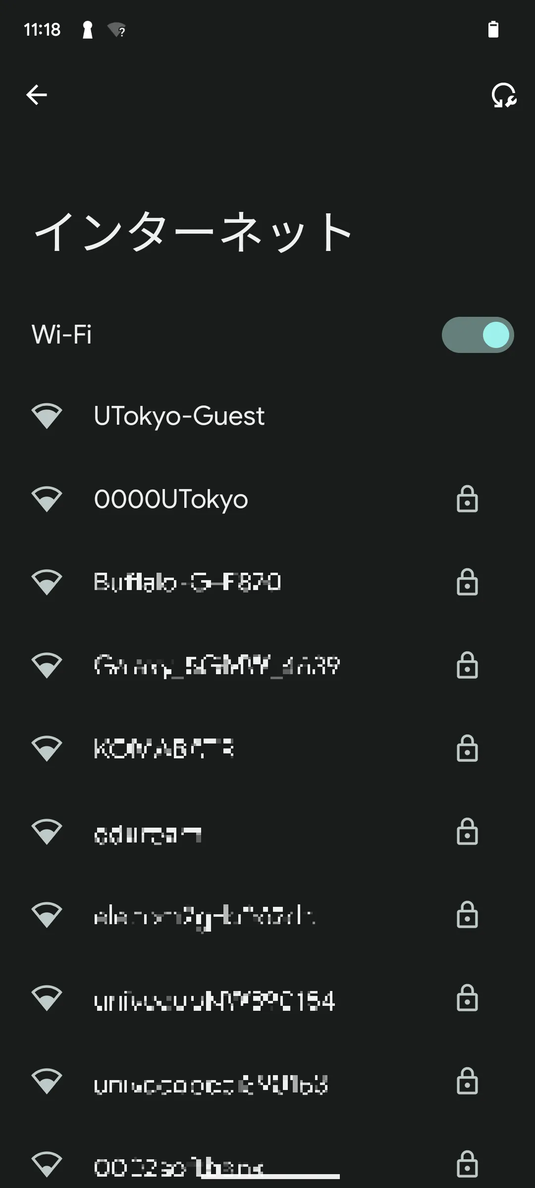 Wi-Fi機能をオンにして少し待つと,Wi-Fi接続設定画面にSSIDの一覧が表示されます.SSIDとは,Wi-Fiの信号を識別するための名前のことです.このSSIDの一覧の中から,0000UTokyoというSSIDを選択して接続してください.