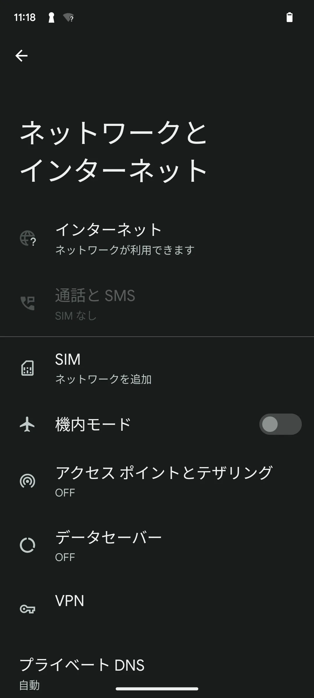 設定アプリの「ネットワークとインターネット」メニューの中から「インターネット」という設定項目を探し,Wi-Fi機能をオンにしてください. ただし,機種によって実際のメニューの名前は異なる場合があります.必要に応じて適当なカテゴリの中から該当する設定項目を探してください.以降の手順でも同様ですので,適宜読み替えながら設定を進めてください.