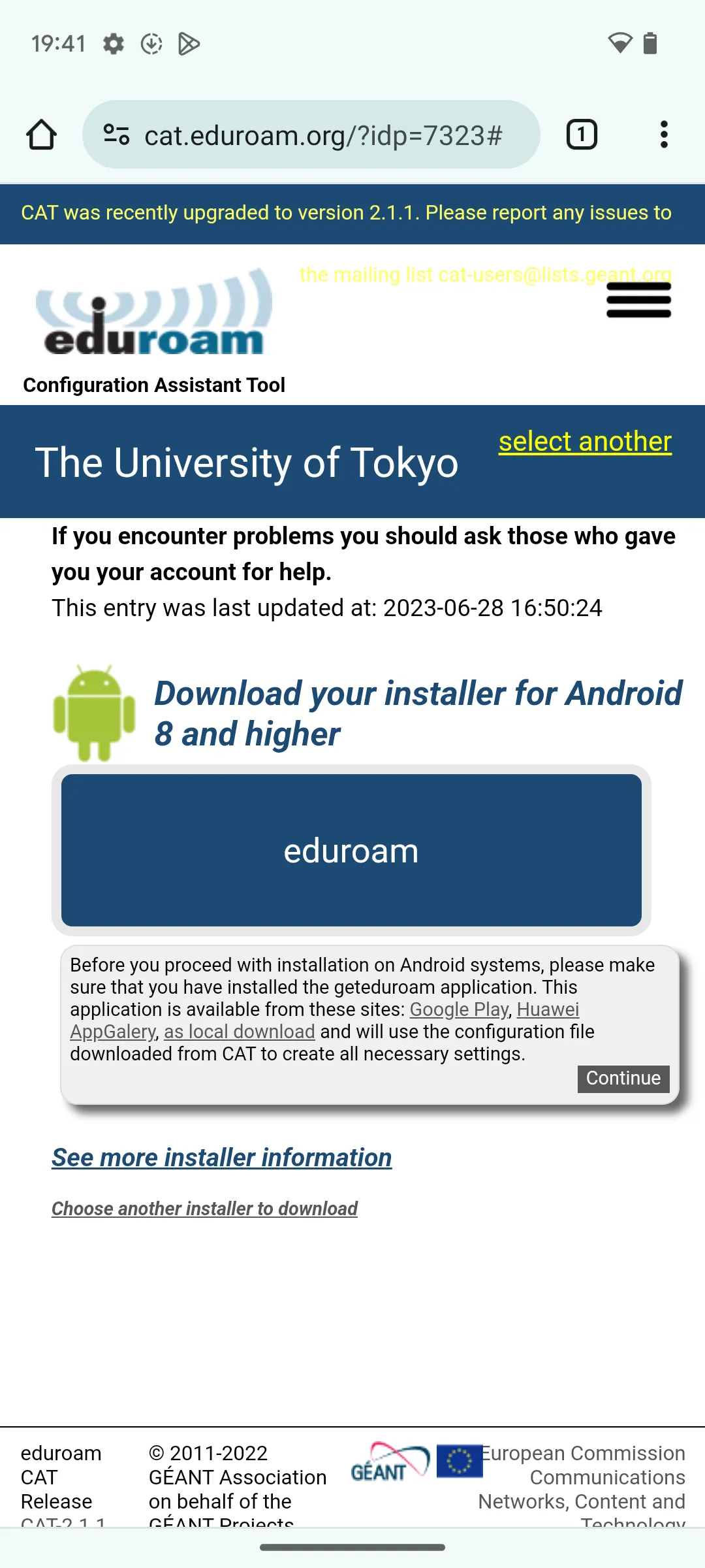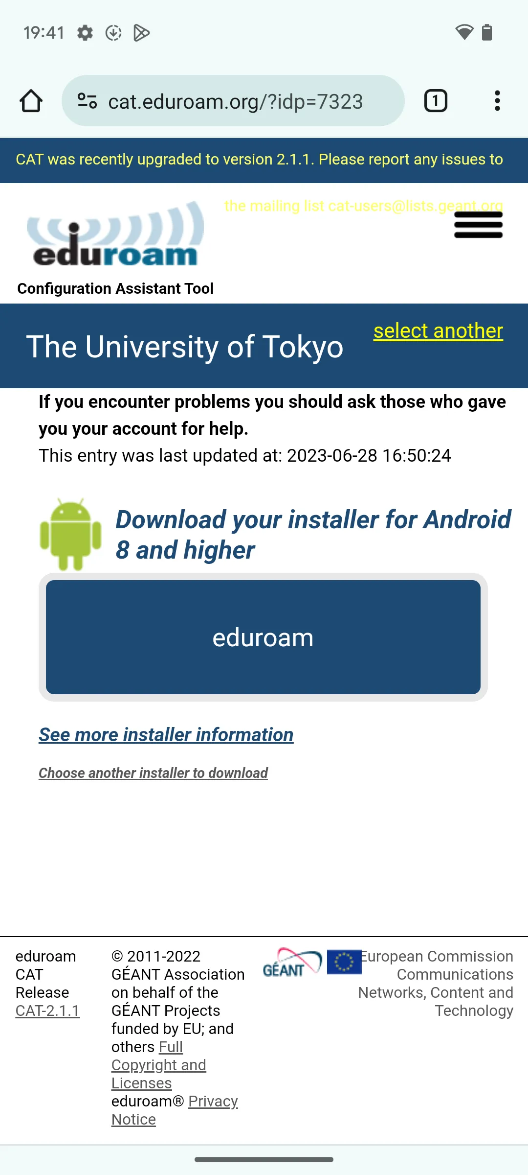 3. ページタイトルが「The University of Tokyo」となっていることを確認してください.また「eduroam」というボタンの上に表示されている内容が,ご自身の端末で用いているOSのバージョンに合致していることを確認してください.合致していない場合は「Choose another installer to download」をタップして正しいものを選択してください.