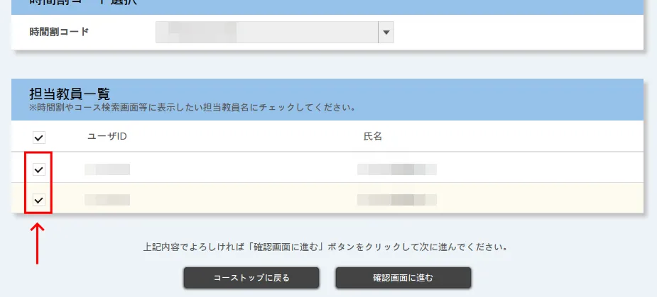 2. 画面の下部に「担当教員一覧」という欄があります.表示させたい担当教員にチェックを入れ,表示させたくない担当教員のチェックを外してください.