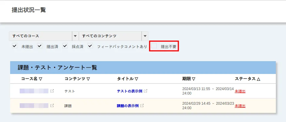 「提出不要」に設定しているものはデフォルトでは表示されませんが,「提出状況一覧」画面の「提出不要」にチェックを入れると表示されるようになります.
