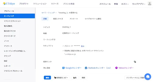 これ以外にも,ミーティングをウェビナーに変換すること(別途追加ライセンスの申請が必要です)や,カレンダーに登録することができます.これらは「詳細」タブから操作できます.