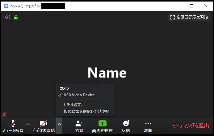 - ビデオマーク : これを押すことによってビデオをオンやオフにできます(画面では現在カメラがオフ状態であるため「ビデオの開始」と表示されています).横にある上マークを押すとビデオに関する設定ができるようになります.