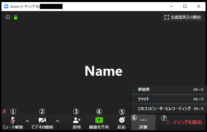 - ミーティングを退出 : ミーティングを退出します.押した後確認画面が出るため,ボタンを押したらいきなり退出するわけではありません.